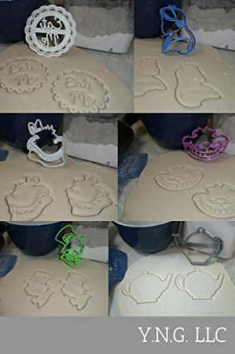 Set of 6 Alice in Wonderland themed cookies cutters: Alice, Cheshire Cat, Mad Hatter, White Rabbit, eat me cookie, and teapot