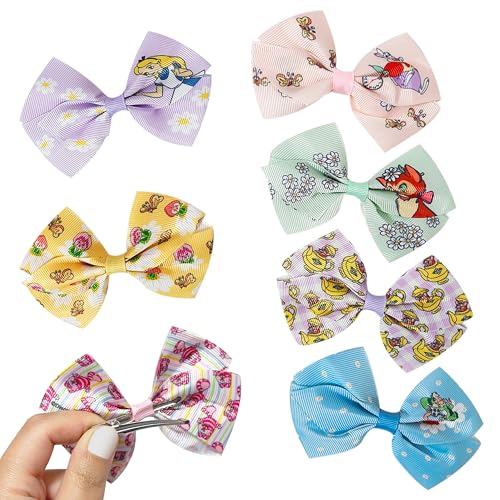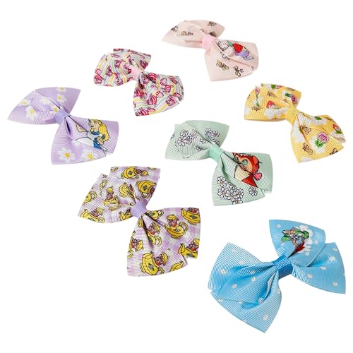 Magical Alice in Wonderland Designs: This 7-pack showcases enchanting prints inspired by Disney’s Alice in Wonderland, featuring beloved characters and dreamy motifs. These bows bring imagination and charm to everyday hairstyles, making each day curiouser and curiouser.