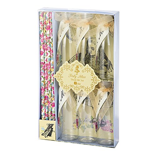 6 plastic bottles with ‘Drink me’ tags and 12 colorful paper straws