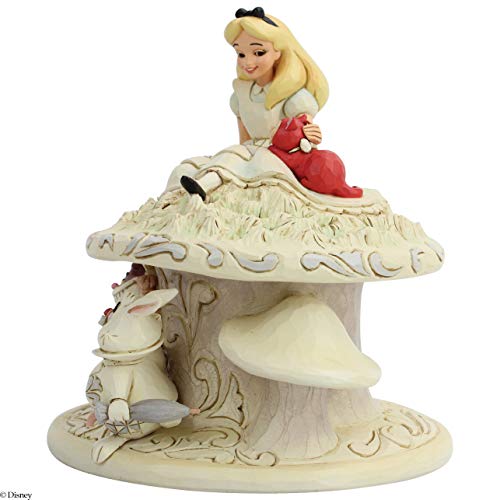 Figurine of Alice sitting on a mushroom, surrounded by Dinah and Wonderland characters. by Enesco / Jim Shore. 7 inch high, 6.4 inch wide x 6.8 inch long