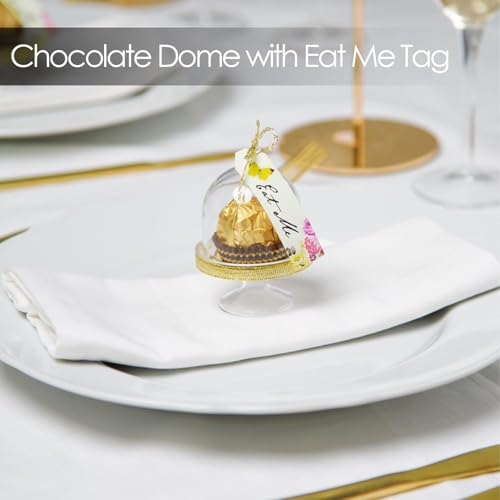 COMPLETE SET: Includes 36 mini cake domes with lids, ‘Eat Me’ cupcake toppers, favor boxes, candle accents, and decorative trinkets for a magical tea party setup
