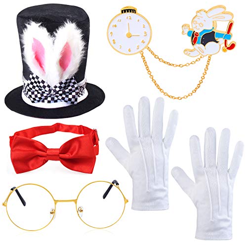 Set of White Rabbit costume accessories: Rabbits Ears Hat, Clock, Glasses, Bowtie, and Gloves
