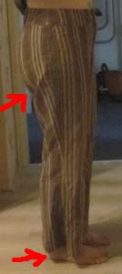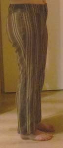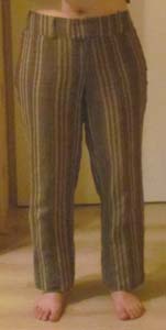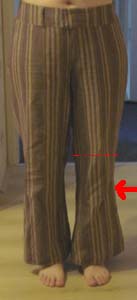 Zo heb ik al een hele tijd een broek in de kast liggen van een stofje dat ik erg leuk vind. Maar de pasvorm was echt heel raar. Broekspijpen zijn bij mij sowieso altijd al een flink stuk te lang, en nu kwam er ook nog eens bij dat deze broek een model had waarbij de pijpen bij de knie wat naar binnen liepen en bij de enkel wat wijder werden. Oftewel: nadat de broek op mijn lengte was gemaakt, zat de versmalling een stukje onder m’n knie, wat er raar uitzag en waardoor ik superbrede heupen en dijen leek te hebben. Daar kwam nog eens bij dat de broek eigenlijk ook iets te wijd was, waardoor ik er een hangkont in kreeg (een van de kledinghoofdzonden) en dat de pijpen aan de onderkant lelijk flodderden.