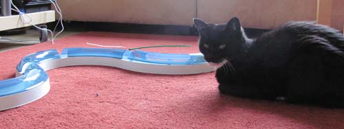 Suus en Gijs brachten nog een cadeautje mee voor Zulay. Een supersonisch speleding! Hun katten zijn er namelijk gek op en meppen enthousiast het balletje door de buis heen. Helaas heeft ons eigenwijze poezebeest het ding nog geen blik waardig gekeurd…