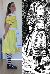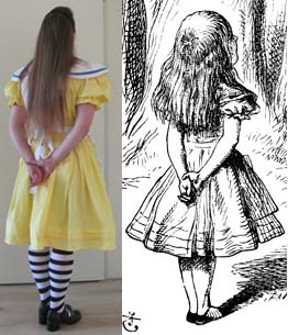 Verder is in latere uitgaven van de Alice boeken de geel/oranje jurk blauw geworden. In de ene versie met blauwe lijntjes op het schortje (en gestreepte kousen!), in de andere versie met rode (en half-hoge kousen!). Disney heeft dit blauwe jurkje overigens overgenomen, en daardoor denkt iedereen nu dat Alice’s jurkje oorspronkelijk blauw was. Maar daar valt dus over te twisten.