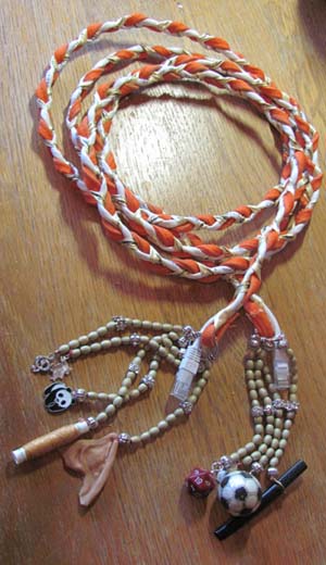 Maar aan het inkorten van de kabel wilde ik me niet wagen, dat zou hoe dan ook lelijk worden. Dus heb ik juist het lint en de jiujitsuband verlengd. Ik had gelukkig genoeg lint laten drukken en ik heb gewoon een tweede strook van de band geknipt en die er aan het uiteinde van de eerste aan gezet. Gelukkig zie je de naadjes nauwelijks in de vlecht.