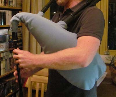 Als tegenprestatie voor het drukken van de uitnodigingen voor onze bruiloft, vroeg mijn doedelzakdocent me om een hoes voor zijn instrument te naaien. Niet voor de mooi, maar tegen de slijtage van het leer.