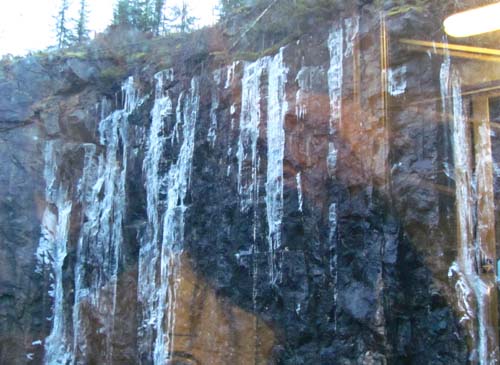 En vanuit de trein zagen we prachtige ijssculpturen aan de rotsen.