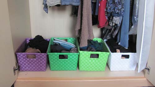 En vier vrolijk gekleurde bakjes. Handig, want zo kan ik eindelijk mijn assortiment aan panty’s, leggings en maillots sorteren (ja, daar heb ik er ook behoorlijk wat van :-X )