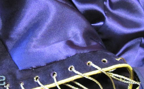 Hieronder nog een close-up van de corsetsluiting aan de achterkant, ook afgewerkt met paspelband en koord: