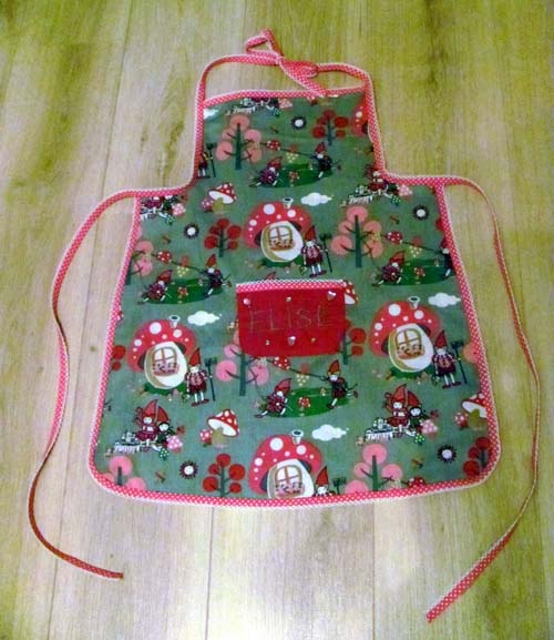 Hier is het resultaat van drie uurtjes werk (let niet op de groene vloer, ik moest de kleuren van de foto aanpassen om die van het schortje goed te krijgen):