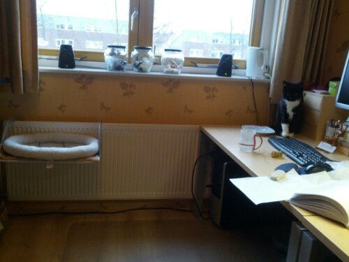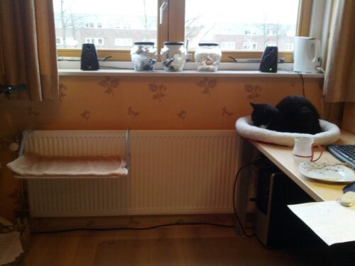 Oh, jullie wachten nog op een statusupdate over mijn geïmproviseerde radiatorhangmat? Een foto van ‘n kat in ‘t bakkie, om precies te zijn?