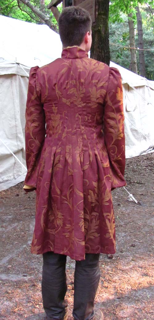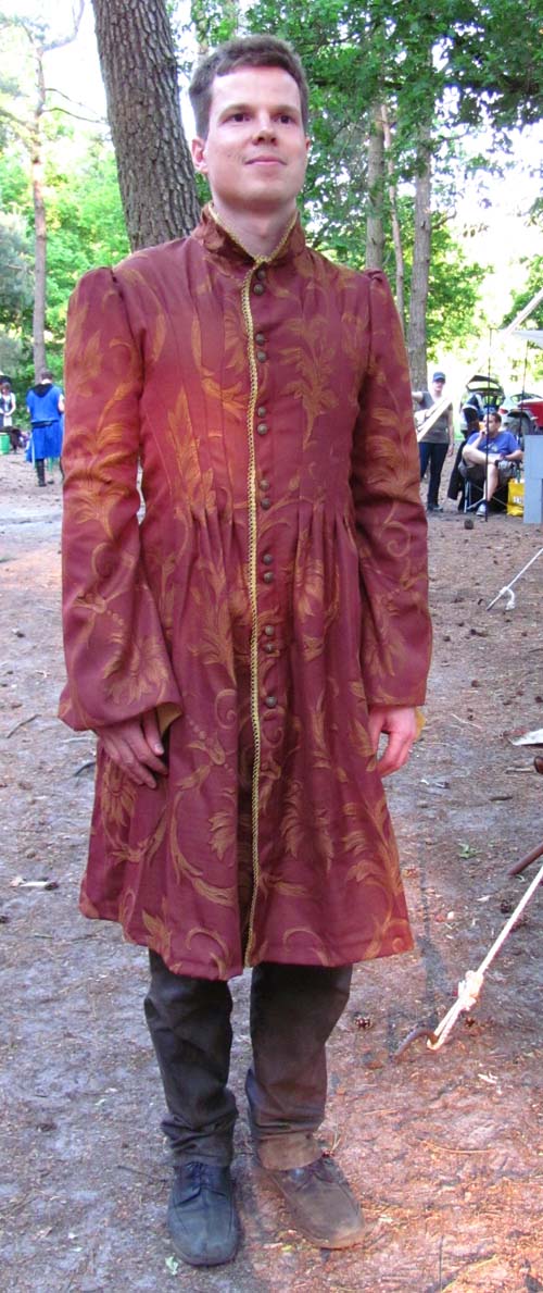 Erik had geen heel duidelijk beeld in zijn hoofd wat het moest worden, behalve “iets chiques, liefst chiquer dan de outfit van Reinard, en in de kleuren van mijn familie (rood en geel)”. Ook na het doorbladeren van wat boekjes ter inspiratie kwamen we niet heel ver, dus schetste ik maar een globale suggestie en liet ik de rest afhangen van de stoffen die ik kon vinden en de praktische haalbaarheid tijdens het naaien zelf.