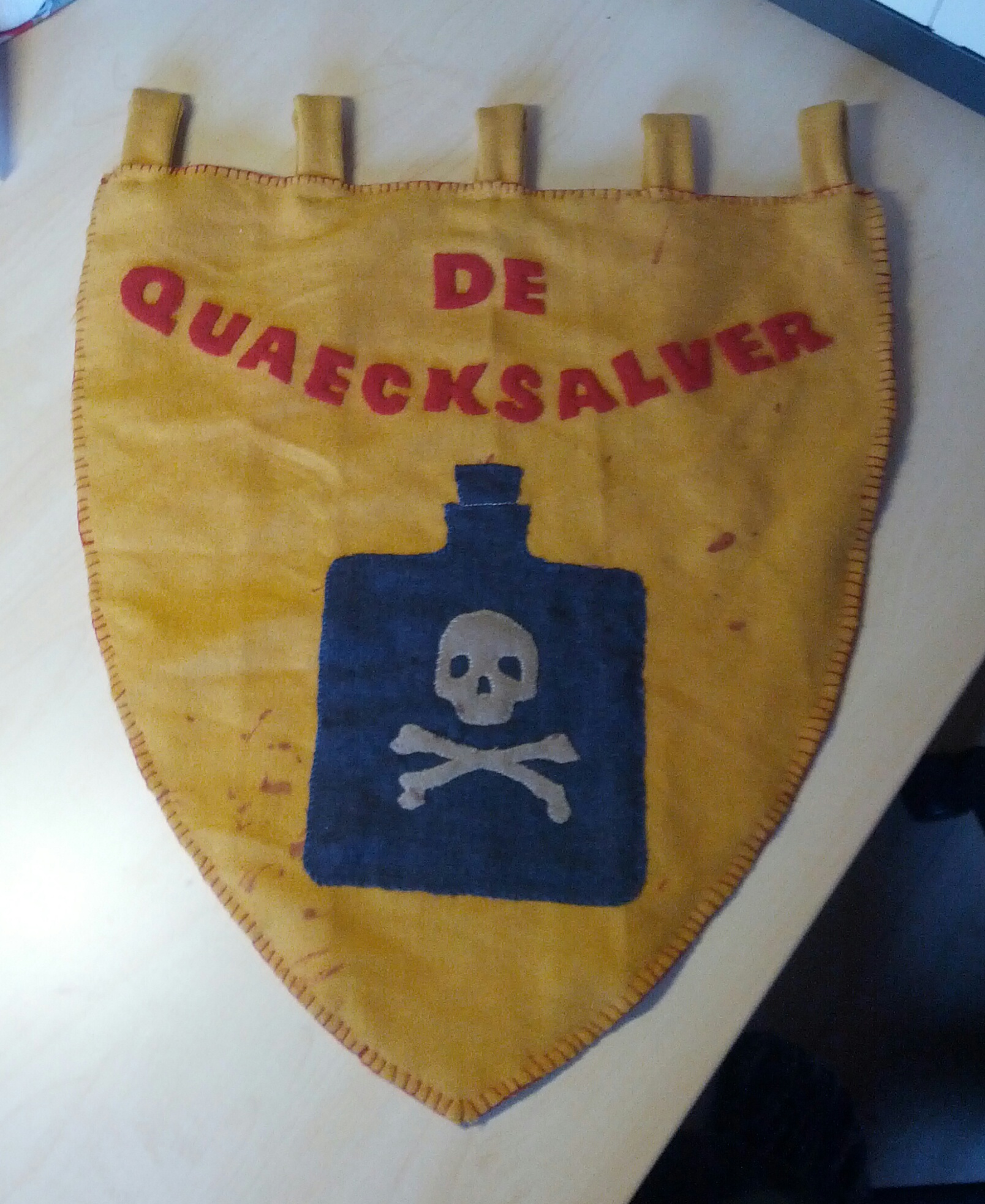 Ik maakte het vaandel van wol en heb alles met de hand gestikt. Ik gebruikte zijdegaren om de letters en afbeeldingen vast te zetten en wolgaren om de twee losse vaandels met een dekensteek aan elkaar te zetten.