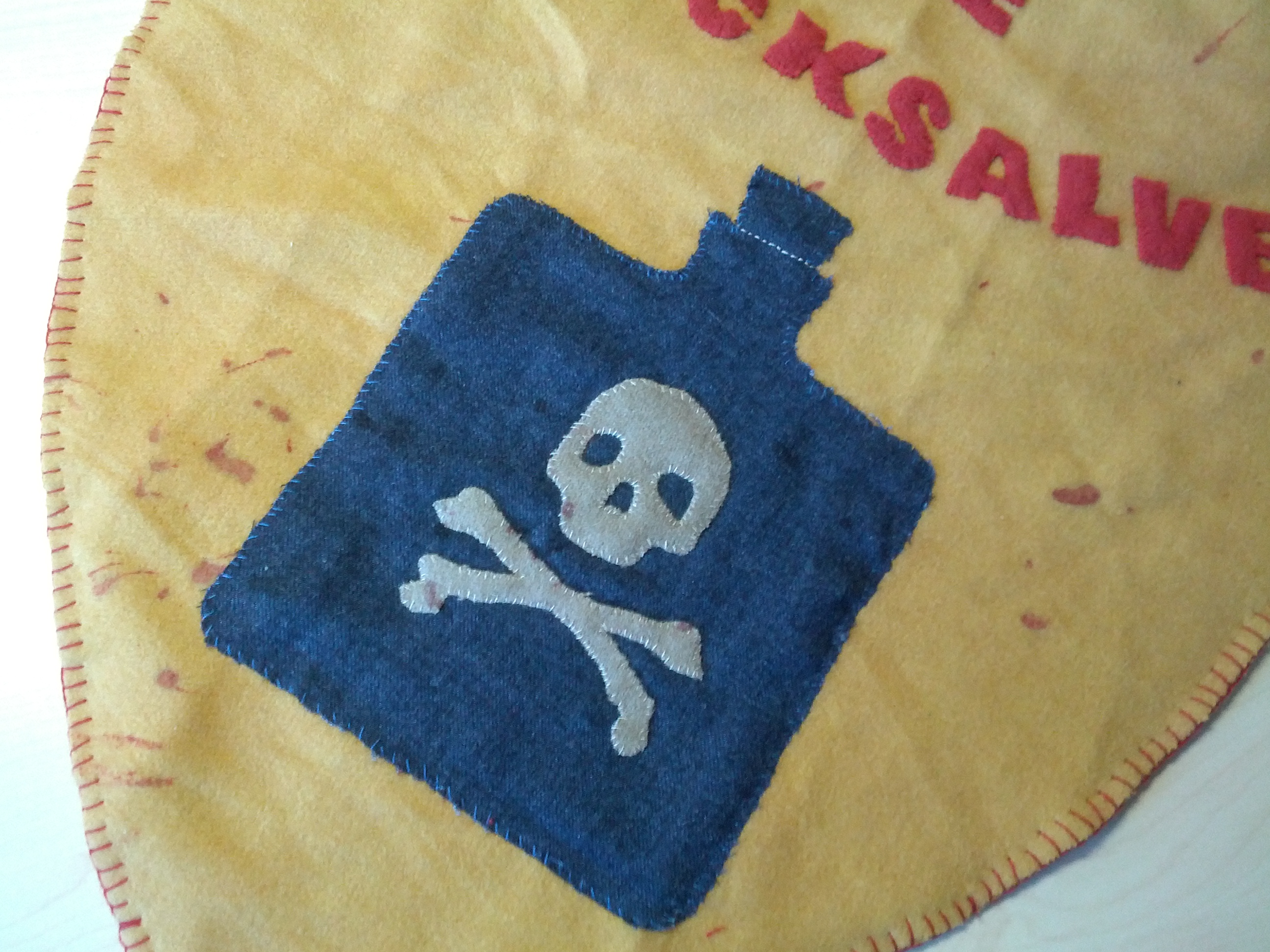 Nou doe ik wel alsof ik een echte reënacter ben. Maar stiekem blijf ik een vieze LARPer. Dus spetterde ik voor het dramatisch effect wat nepbloed over de kwakzalverzijde: