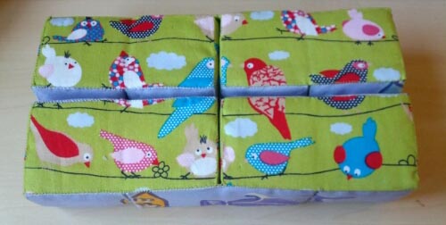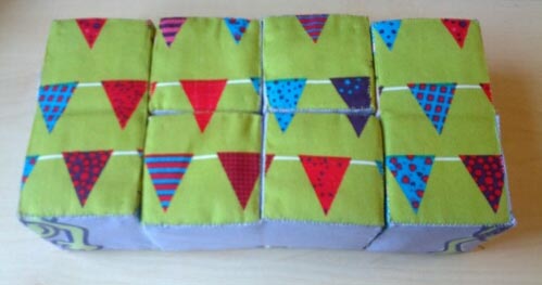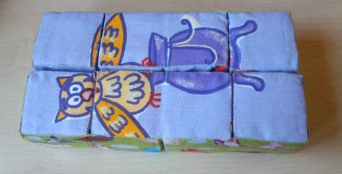 Een tijd geleden gingen we op bezoek bij Mark’s oma. Ik weet niet meer waarom, maar ze liet me toen een zelfgemaakt dinges zien dat me intrigeerde. Het dinges bestond uit 8 kubusjes, bekleed met verschillende stofjes. En je kon ‘m op verschillende manieren in elkaar vouwen, waardoor steeds een ander stofpatroontje boven kwam te liggen.