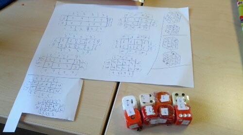 Omdat haar kubus weliswaar bestaat uit patroonstofjes, maar ze niet mooi in elkaar doorlopen als je de kubus correct vouwt, wilde ik wel zeker weten dat in mijn versie alles goed uit zou komen. Dus maakte ik met behulp van Mark’s dobbelstenen en plakband een proof of concept, waarmee ik veel duidelijker kon zien hoe de verschillende vlakken met elkaar samenhangen bij verschillende vouwwijzen (want sommige vlakken komen soms ondersteboven tegen een andere aan en dat zie je niet in bovenstaand patroon), en tekende ik de verschillende mogelijkheden uit: