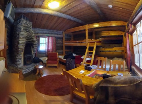 Daar hadden we helemaal een schattige cottage; met open haard, ingebouwde stapelbedden en, uiteraard, een sauna.