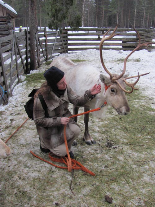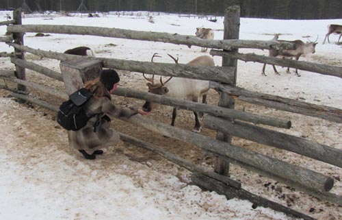 Yay, een rendier-kinderboerderij!! Dus ik stoof enthousiast naar het hek en deed wat voer in mijn uitgestoken hand.