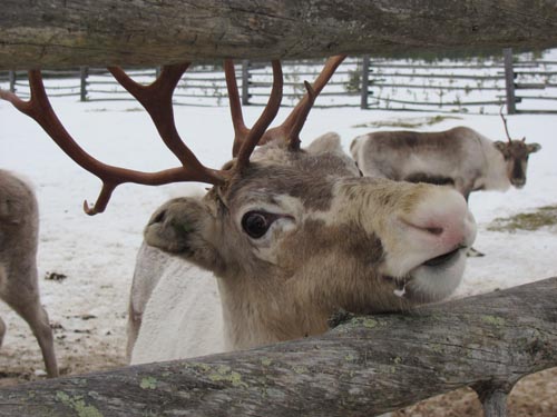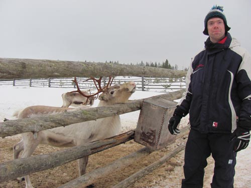 Vergeet het maar. Geen vriendelijk rendier te bekennen. De verveeld herkauwende beesten namen nog niet eens de moeite om mijn richting op te kijken! :-S
