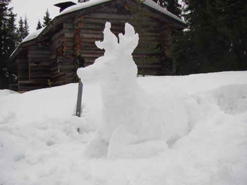 ‘s Middags besloten we eventjes rustig aan te doen. Mark ging een schoonheidsslaapje houden (voldoende slaap krijgen in een bloedheet gestookt hutje valt namelijk tegen), maar geïnspireerd door al die rendieren greep ik die middag aan om voor ons hutje een sneeuwsculptuur te maken. Initieel begon ik aan een staand rendier: