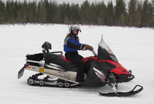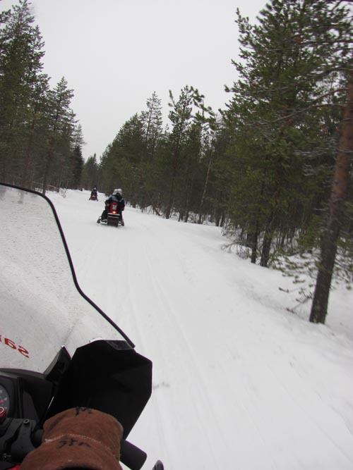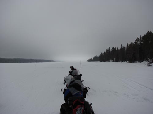 Ditmaal ging het een stuk beter dan maandag, hoewel het nogal een bumpy ride was, aangezien de sneeuw nog wat verder was gesmolten. Op het meer konden we een stukje harder dan in het bos, maar de snelheden van maandag haalden we helaas niet meer wat maar goed ook was, want we hoorden nu pas dat 80 km/u de maximumsnelheid op een meer is.
