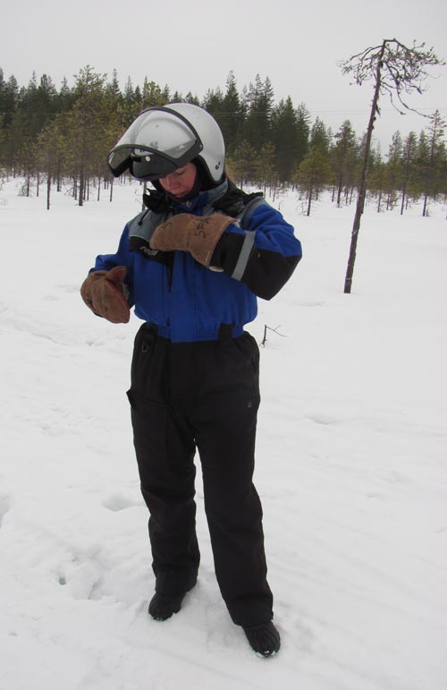 Mark en ik mochten om beurt een stukje rijden. Dat was best wennen: dat stuur schudt namelijk alle kanten op! Na vijf minuten was ik al bek-af, en het duurde even voordat ik doorhad dat ik er niet tegen moest vechten, maar gewoon moest accepteren dat ik automatisch de sporen van onze voorgangers volgde en dat sturen op een sneeuwscooter een kwestie is van ‘ongeveer de goede richting op mikken’. Da’s best even slikken, aangezien je toch zo’n 250 kg machine onder je bips hebt…