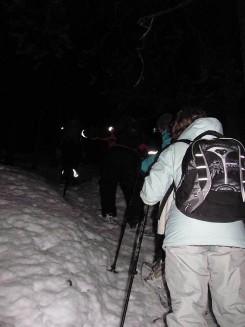 Eenmaal de top van de berg bereikt, hadden we een prachtig uitzicht op de omgeving, met in de verte de lichten van het dorpje en de ski-piste.