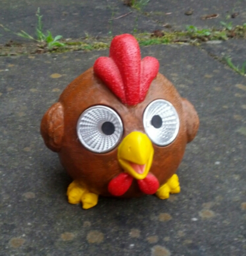 Ik had in het tuincentrum eigenlijk al alles gevonden wat ik nodig had, maar toen liep ik langs deze zonne-energetische kip. Die was té over de top hilarisch om te laten staan. Dus mocht ‘ie ook mee. Niet zelf gemaakt, wel lollig ![]()