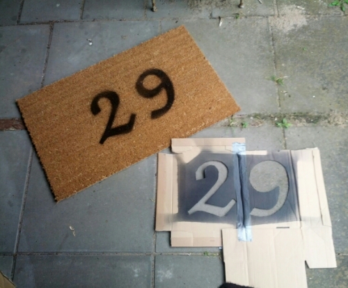 Dus, een deurmat met huisnummer ging het worden! Want volgens mij moest zo’n kokosmat best met verf te bespuiten zijn.
