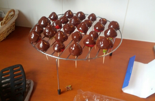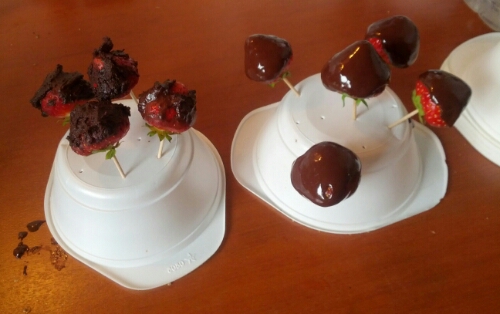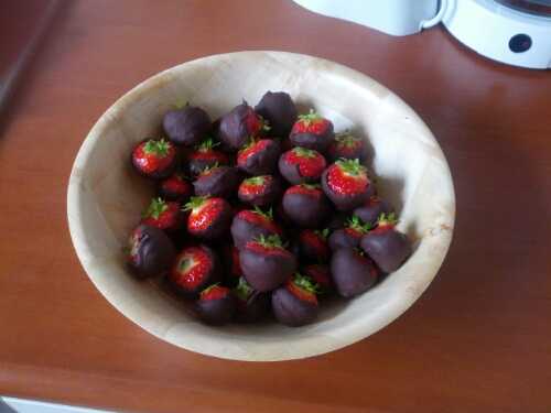 Ik was er al snel uit: aardbeien met chocolade. Lekker, maar niet moeilijk om te maken. Kwestie van chocolade smelten en de aardbeien erin dopen.