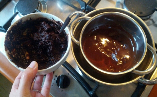 Mijn eerste poging ‘au bain marie’ faalde jammerlijk. Het vermoeden dat dit geen succes ging worden, rees al snel – te weten op het moment dat het kokende water in de omringende pan over de rand van het bakje met chocoladebrokken begon te klotsen en ik mezelf boven de gootsteen de chocolade vond af te staan gieten. Hmm… this can’t be right