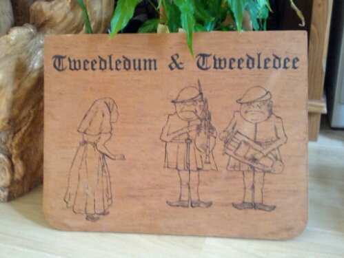 Eigenlijk had ik ook hier zo’n mooie boomstamplank voor willen nemen als ik voor het uithangbord van The Basic Elements heb gebruikt. Maar het bord voor Tweedledum & Tweedledee moet minimaal een A4’tje hoog en twee A4’tjes breed zijn en ik kon bij de bouwmarkt helaas geen plank vinden van zo’n afmeting.