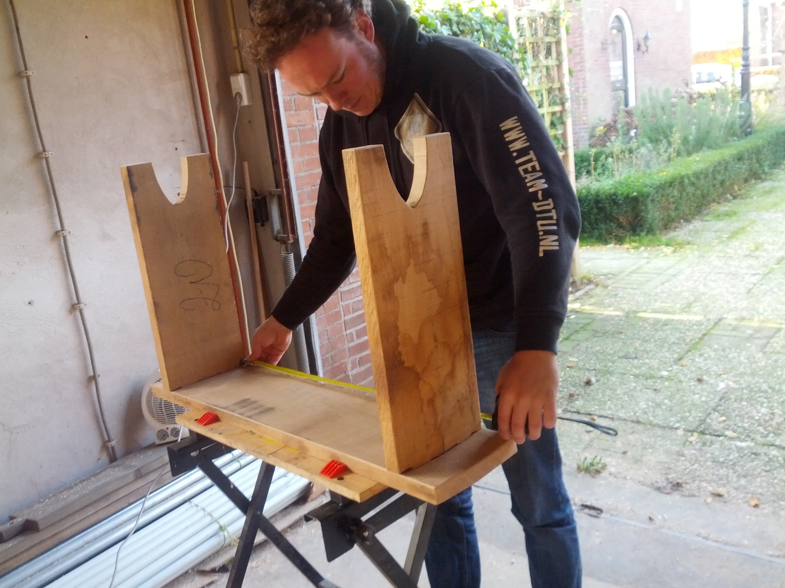 “Het begon met twee eikenhouten planken, gehaald bij de houthandel. Die waren niet goedkoop (€54,36) maar het is wel goed hout, niet van dat kromme grenen dat je bij de Gamma haalt.”