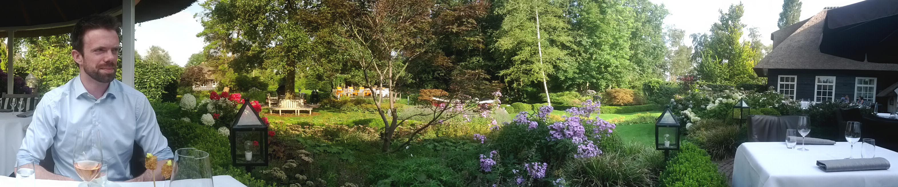 Gelukkig vonden we een twee-sterrenrestaurant in Giethoorn, waar ook een hotel aan was gekoppeld. Lekker fancy-schmancy hoor! Grote kamers, van alle gemakken voorzien, en een prachtige tuin waar we in mochten dineren.