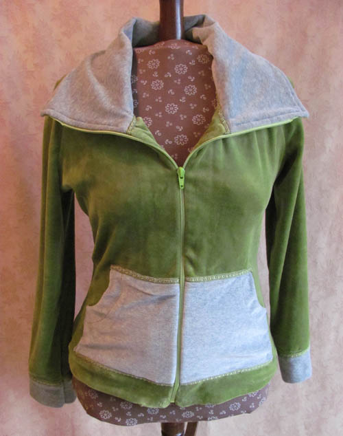 Dat is niet een helemaal realistisch bedrag, want van de ene kant zou ik wat minder moeten rekenen, omdat ik van beide stoffen nog best wel wat over heb. En ook de band heb ik niet helemaal opgemaakt. Anderzijds kostte het juist €5,- meer, want ik had in eerste instantie een andere groene stof gekocht. Maar die stretchte niet en dat werkte niet – ik had totaal geen bewegingsruimte meer bij mijn schouders. De eerste versie van het vestje heb ik dan ook helaas weg moeten gooien. Vandaar dat ik er ook veel te veel tijd aan heb besteed: 17,5 uur.