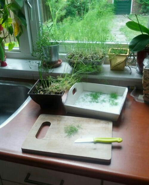 Maar de venkel tierde welig. Zo flink zelfs, dat ik er drie bakken mee kon vullen! En nu was het eindelijk tijd om te oogsten.