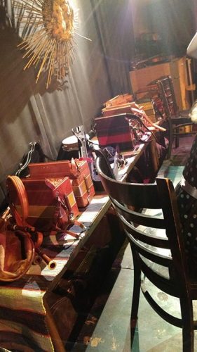 Alle instrumenten van alle muzikanten werden achter het podium gestald. Het lijkt wel een muziekwinkel! :-P