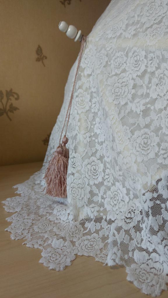 Verder had ik gedacht dat ik gewoon een mooie lap kant in de winkel kon scoren. En ja, dat kan inderdaad, maar… een brede lap is heel wat anders dan een randje, en loeiduur! Ik wilde uiteraard weer iets fancy’s, met een mooi schulprandje om over het einde van de parasol te laten bungelen. Via Markplaats.nl vond ik de perfecte lap! Ik kon mijn geluk niet op. Toen bekeek ik de prijs: €425,-. Bleek het een of ander haute couturestofje uit Parijs te zijn. Ik en mijn dure smaak…