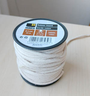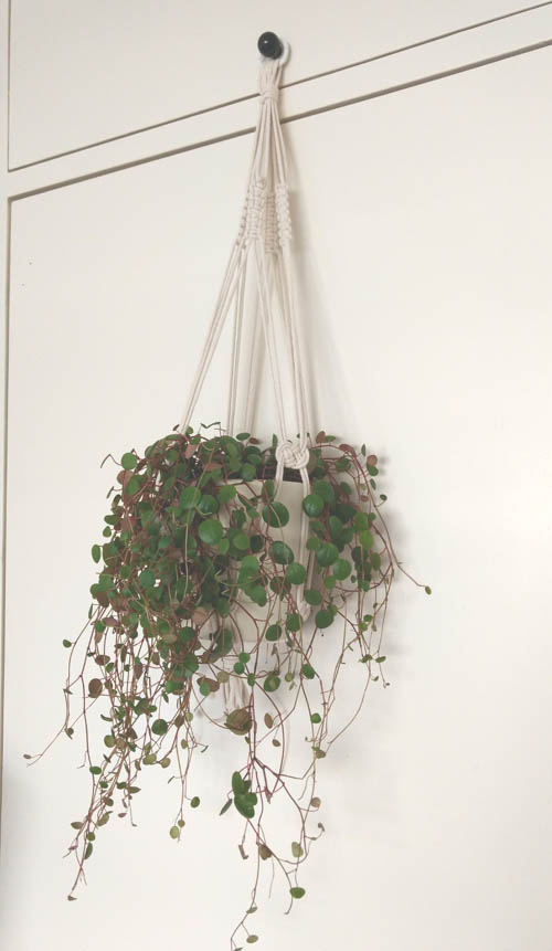 Bij de plantenwinkel had ik een hangplant in zo’n lelijke plastic houder met haak gekocht en bij de tweedehandswinkel scoorde ik een aardewerken potje voor 50 cent. Bij de bouwmarkt vond ik een rol katoenen koord.