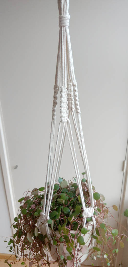 Uiteraard bleek een groot deel van mijn prachtige knoopwerk precies te verdwijnen onder de plant, nadat ik de takjes netjes had geschikt. Maar het voordeel van macramé is dat de knoopjes niet permanent vastzitten. Je kunt ze dus prima naar wens omhoog of omlaag verschuiven, zodat ze beter uitkomen rondom de pot en plant die je erin hangt. Dus na het nemen van deze foto’s heb ik de boel nog wat bijgesteld.
