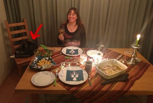 Sammy heeft zich keurig gedragen: hij claimde mijn stoel tijdens het koken van het hoofdgerecht, dus we hebben hem gezellig naast ons laten zitten. Hij heeft helemaal niets van tafel gejat!