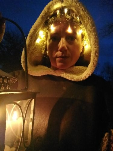 En dus haalde ik weer alle lantaarntjes uit mijn opslag, ditmaal inclusief mijn twee nieuwe tuinfakkels (op zonne-energie, en ze geven flakkerend licht alsof er daadwerkelijk een vuurtje in brandt!). Maar trok ik ook mijn zelfgemaakte winterse mantel aan en zette ik het lichtsnoer dat ik tijdens de kerstborrel van mijn werk had gedragen, weer op mijn hoofd. Zo, was dat een magische verschijning of niet??