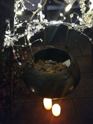 – Nodig de kinderen niet uit om een koekje uit je ketel te komen halen, want ze stormen van alle kanten op je af en in het gedrang worden alle lichtjes vertrappeld. Pak de ketel van de driepoot en loop ermee naar de stoep.