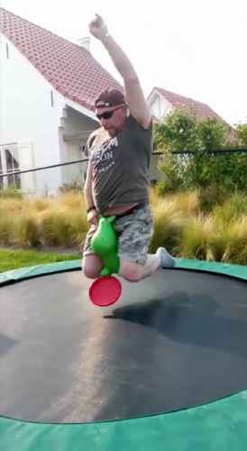 Met Josh’ skippykoe en een trampoline kun je prima rodeostier rijden. :-P