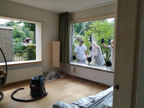 Ik plande de glaszetters in mijn vakantie in, zodat ik daarna gelijk de kozijnen kon gaan schilderen. Want ja, dat moet dan ook en iedereen zegt dat je daar wel 2 weken voor moet uittrekken (en glas vervangen is dermate duur dat schilderen uitbesteden er even niet in zit). Vanwege de bouwvak konden ze pas in de tweede week van mijn vakantie komen. Direct na Castlefest. Oftewel: de dag na late en brakke thuiskomst moest ik om 8 uur ‘s ochtends voor ze paraat staan. *kreun* Maar goed, je moet er iets voor over hebben. Gelukkig was ik zo verstandig om mijn vensterbanken al vrij te maken voor vertrek, zodat ik dat niet ook die ochtend nog moest doen.