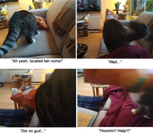 Ook Sammy heeft zich goed vermaakt. In het begin wist hij niet zo goed wat hij met de half verbouwde woonkamer en al die vreemde mensen aanmoest, en net als ik heeft hij nog steeds problemen met de overgang van de zomer- naar de wintertijd, maar uiteindelijk nestelde hij zich knus tussen ons in. En uiteraard probeerde hij af en toe wat snaai te confisceren.