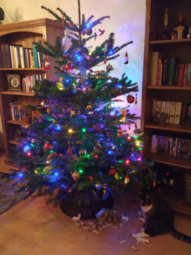 Wat was het weer ontzettend gezellig om met een huiskamer vol mensen al dan niet meerstemmig kerstliedjes te zingen en lekker te eten! Omdat ik van twee jaar geleden al wist hoe fijn de stemming daar was, had ik het optuigen van de kerstboom en verder versieren van de woonkamer bewust tot vandaag bewaard, zodat de hele dag in het teken stond van pre-kerstpret. En wat maakt je nou gelukkiger dan leuke dingen met leuke mensen doen, om daarna thuis je kat precies op de maat van “It’s the most wonderful time of the year” te horen snurken terwijl jij lampjes ophangt? <3