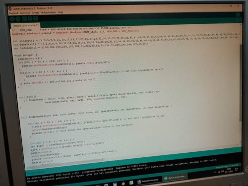 Nu alleen nog ‘even’ het script opnieuw schrijven zodat het geschikt werd voor 250 ipv 109 ledjes. En zorgen dat de gewenste effecten erin zaten (uit oogpunt van efficiënte en vouwbare ledstripbevestiging op de stof zaten de lampjes van het logo uiteráárd niet op volgorde achter elkaar…). Maar gelukkig bleek het programmeren het makkelijkste onderdeel van het hele project te zijn. C++ is niet zo heel moeilijk en ik heb al vaker in andere talen wat geprogrammeerd, dus het basisconcept snap ik wel. Bovendien zijn er een hoop voorbeeldscriptjes online te vinden, die ik kon tweaken naar mijn eigen wensen.