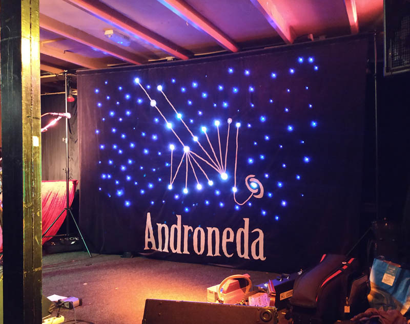 Het werkte ook echt heel goed op het podium. Helaas was het plafond wat laag, dus de onderkant van het doek hing omgekruld op de grond, maar het paste op zich wel. Had het ding er niet gestaan, dan waren er wat lelijke tafels op de achtergrond zichtbaar geweest. En een hoop zooi – zo’n gordijn blijkt ook ideaal om al je meuk zoals instrumentkoffers, tassen, jassen en meer achter te gooien zodat het podium opgeruimd blijft! Plus een onverwachte fuctionaliteit: je kunt je er perfect achter omkleden als je je podiumoutfit nog niet aan hebt! ![]()